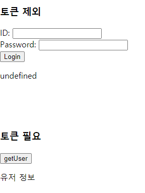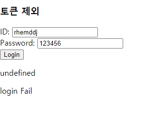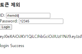 여기서 ID에 "rhemddj", Password에 "12345"를 입력한 뒤 Login버튼을 누르면 로그인 처리 여부가 보이고 정상적으로 로그인이 될 경우 토큰 정보도 표현이 됩니다.