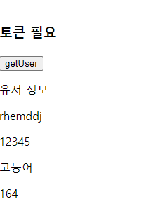 로그인이 성공된 경우에는 gerUser버튼을 누르면 토큰에 담겨있던 유저 정보를 서버에서 가져와 화면에 뿌려주게 됩니다.