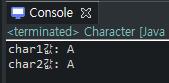 여기서 또 특이한 점은 char에는 문자 하나를 담거나 또는 정수값을 담을 수 있습니다.