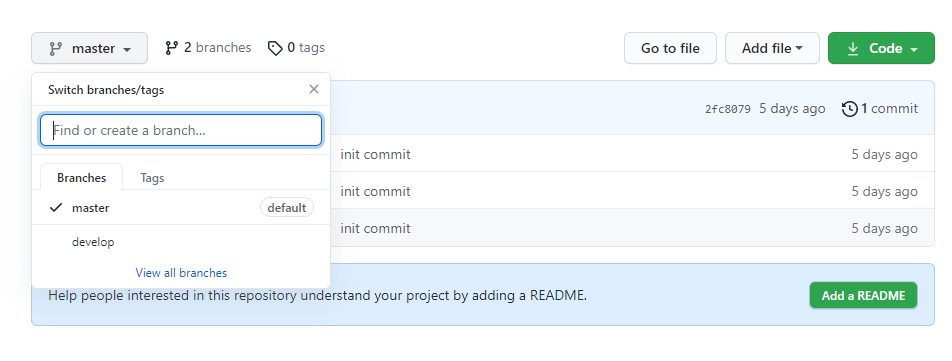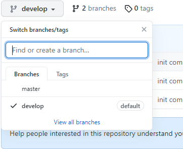 그리고 다른 브랜치를 확인하기 위해 브랜치 리스트를 확인해보면 다음과 같이 develop브랜치에 default문구가 보이게 됩니다.
