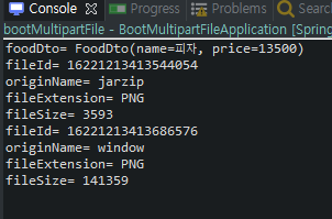 다음으로 파일 업로드 버튼을 누르게 되면 스프링에 데이터가 넘어가게 되고 콘솔창에 다음과 같은 문구가 출력이 됩니다.