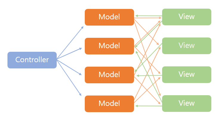 하지만 model과 view가 서로 양방향으로 의존되어 있는 관계 때문에 프로젝트의 규모가 점점 커짐에 따라 프로젝트의 복잡도도 같이 커지게 된다는 단점을 가지고 있습니다.