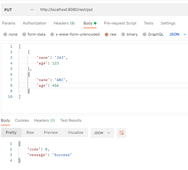 put을 이용해서는 서버에 배열로 된 데이터를 넘겨주고 서버로부터 객체를 리턴 받아 보겠습니다.