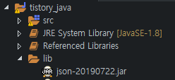 그리고 그런 방법들은 어떨지는 모르겠으나 제가 사용하는 방법은 json클래스를 사용하기 위해 jar파일을 등록해야 하기 때문에 jar파일부터 프로젝트에 집어넣어 보도록 하겠습니다.