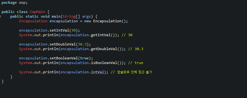 말을 이어 만약 getter, setter를 이용하지 않고 encapsulation.intVal과 같이 접근을 하게 되면 어떻게 될까요?
