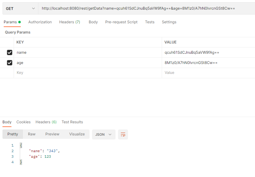 테스트는 사용자 request로는 암호화된 name과 age를 전달했을 때 controller에서 데이터를 받아 바로 리턴할 경우 어떤 값이 리턴되는지를 확인해보겠습니다.