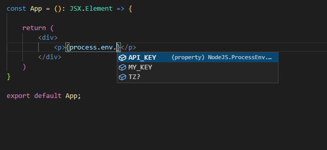 위와 같이 설정을 했다면 아무 파일에나 다음과 같이 process.env. 을 입력하고 ctrl+space를 눌러 자동완성이 가능한 목록들을 확인할 수 있습니다.