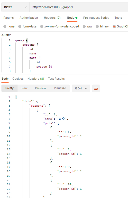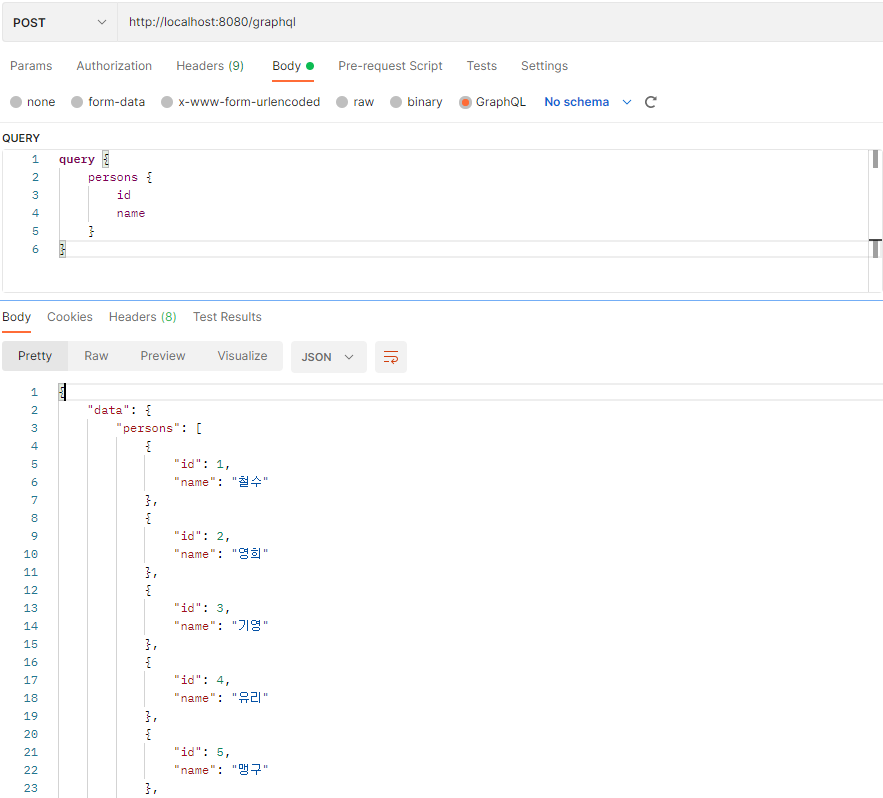 데이터를 조회하는 쿼리문을 작성할 때 id와 name만 입력했기 때문에 Response로 id와 name만 오는 것을 확인할 수 있습니다.