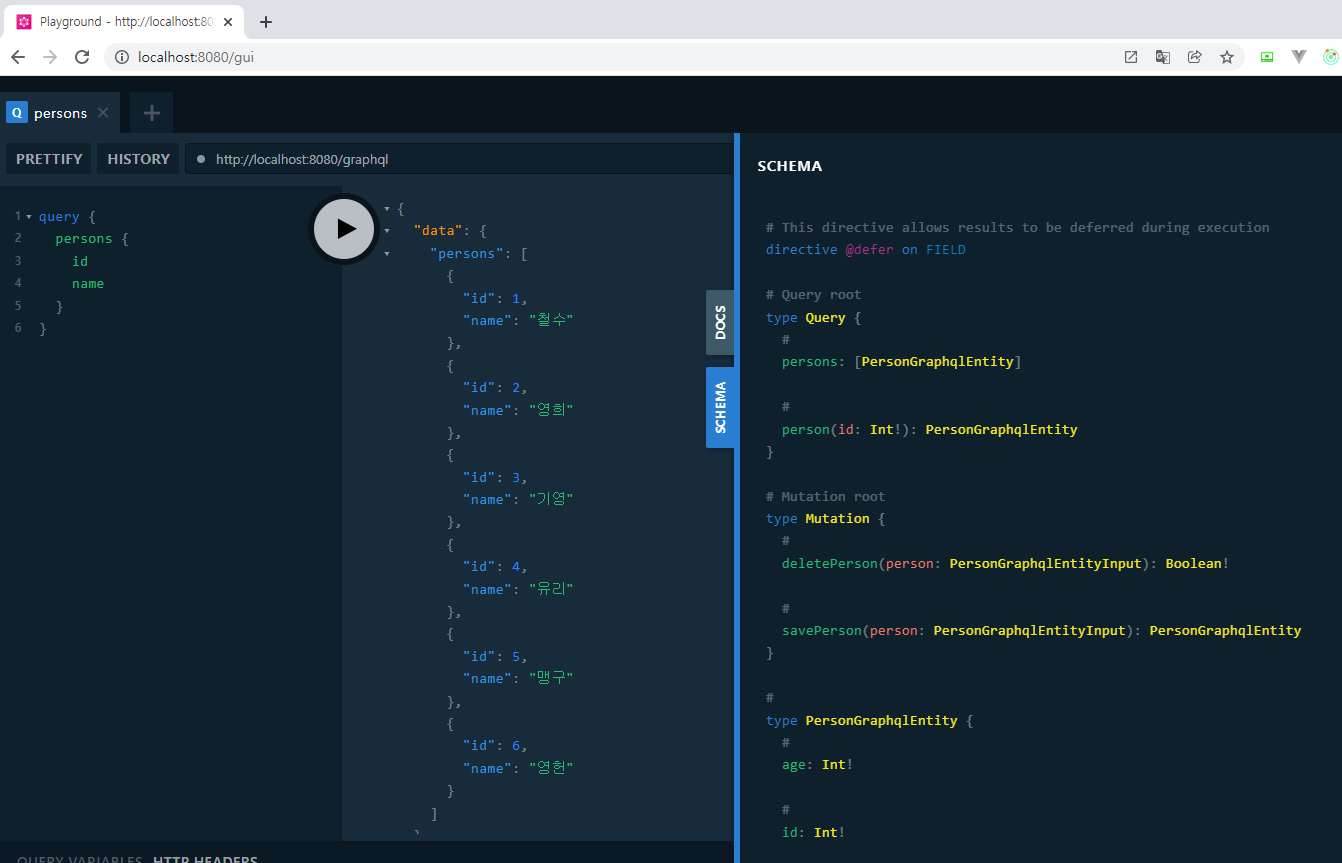 개발된 GraphQL을 테스트할 때 포스트맨 말고도 서버 자체에서 자체적으로 GUI를 만들어서 테스트할 수도 있습니다.