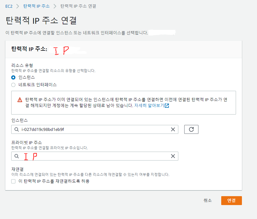 연결하고 싶은 인스턴스 값을 선택해주고 프라이빗 IP 주소도 선택해주면 됩니다.