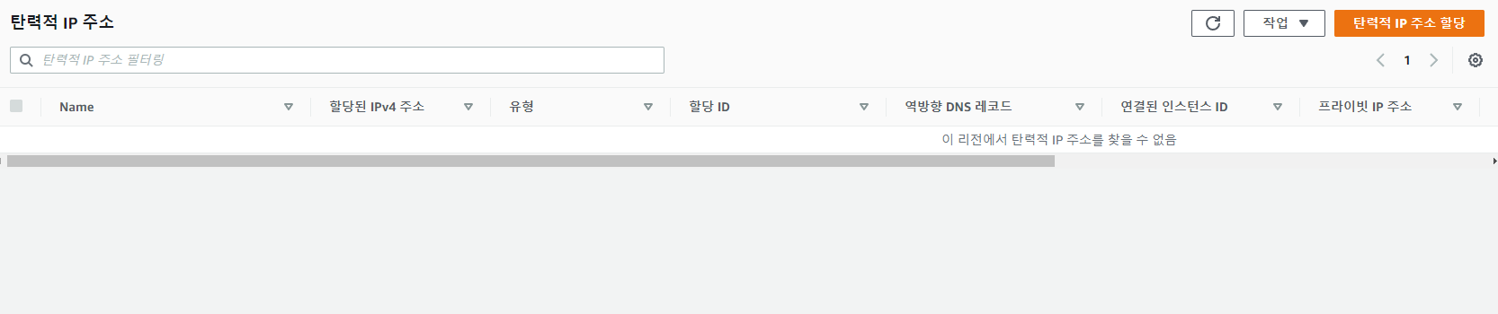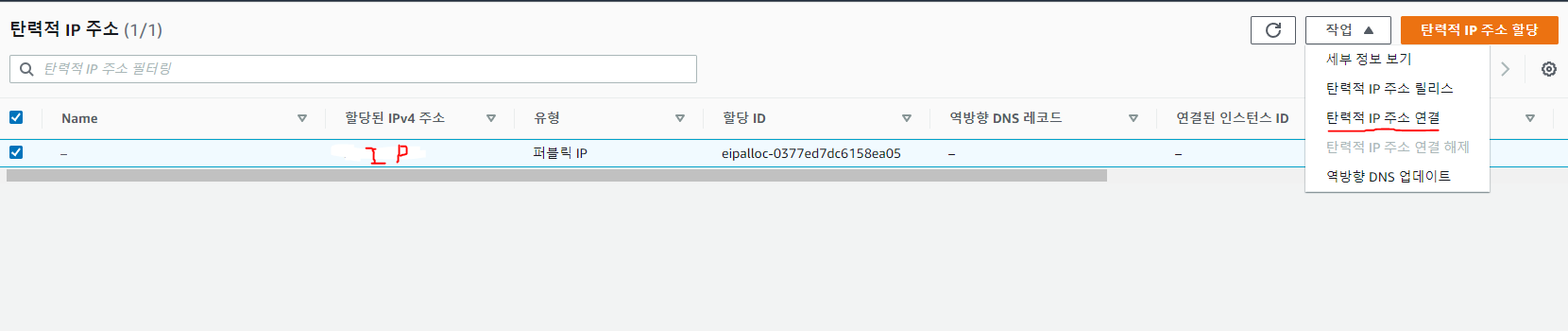 탄력적 IP 할당이 완료되면 위와 같이 리스트에서 확인이 가능합니다.