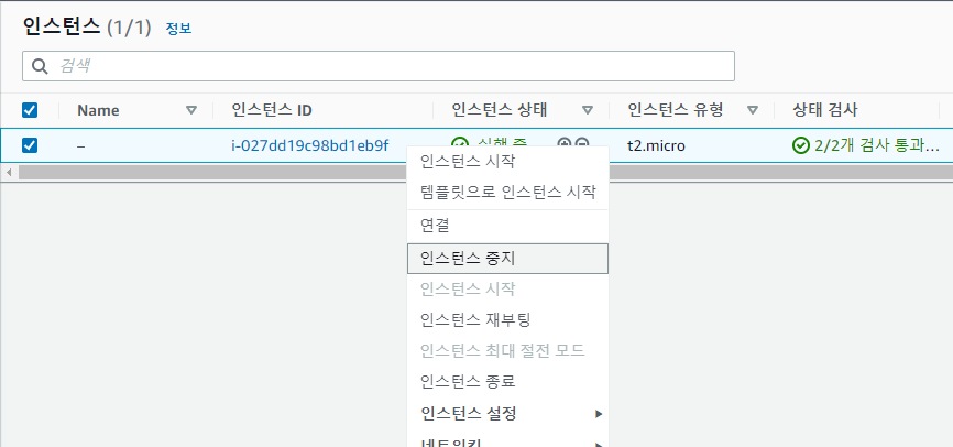 예를 들어 다음과 같이 인스턴스를 우클릭하면 인스턴스 중지, 시작 등의 작업들을 확인할 수 있습니다.