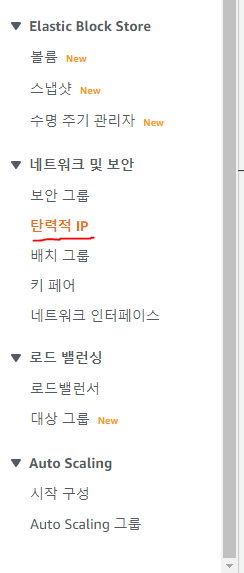 EC2 서비스에 들어와서 좌측에 있는 리스트를 아래로 스크롤하면 네트워크 및 보안 탭에 탄력적 IP를 확인할 수 있습니다.