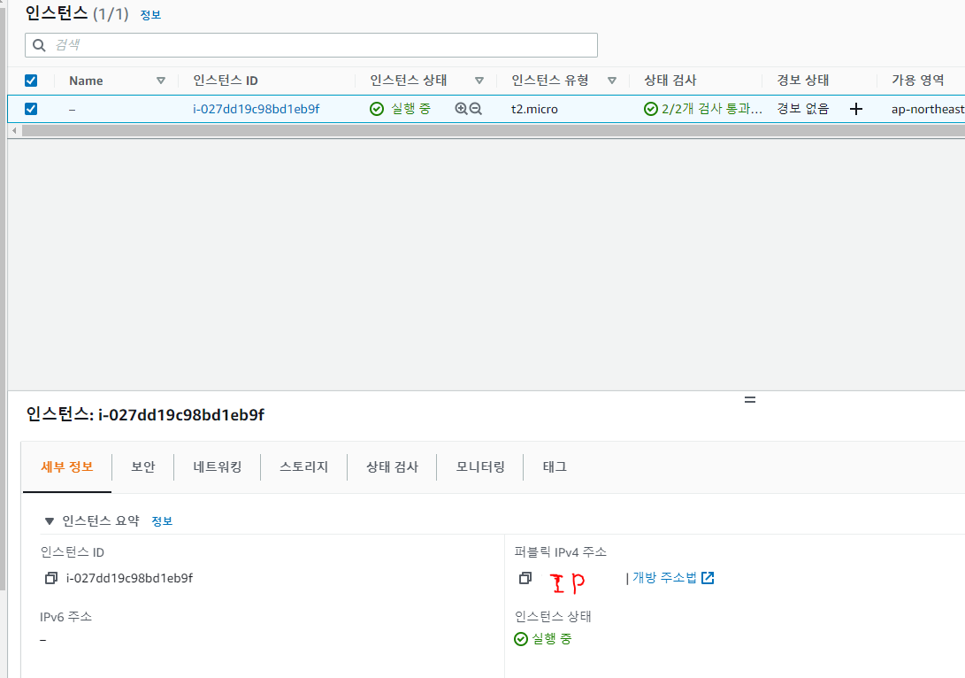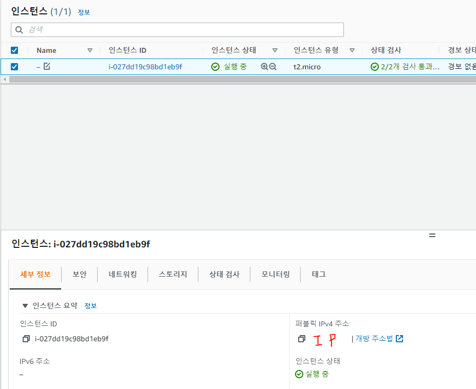 인스턴스 목록에서 탄력적 IP를 부여한 인스턴스의 정보를 확인해보면 퍼블릭 IP 주소 값이 탄력적 IP의 주소 값으로 변경된 것을 확인할 수 있습니다.