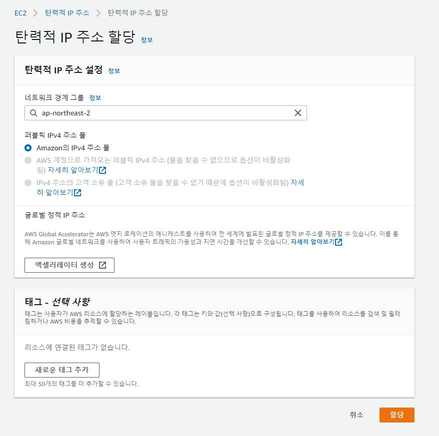 탄력적 IP 주소 창 우측 상단의 탄력적 IP 주소 할당을 클릭해주시면 됩니다.