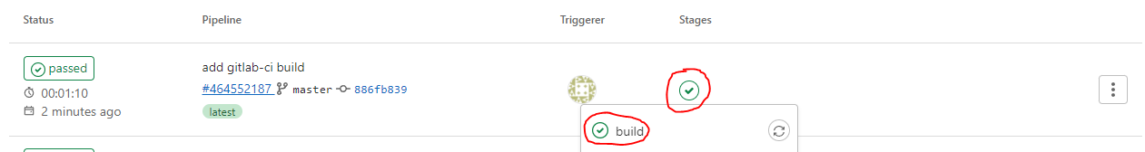 push 한 뒤 발생된 trigger가 정상적으로 동작 완료되었다면 Pipelines에서 다음과 같이 stage가 추가된 것을 확인할 수 있습니다.