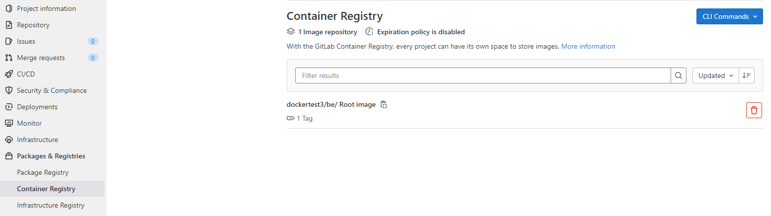 GitLab → Packages & Registries → Container Registry에 접속하면 다음과 같이 이미지가 생성된 것을 확인할 수 있습니다.