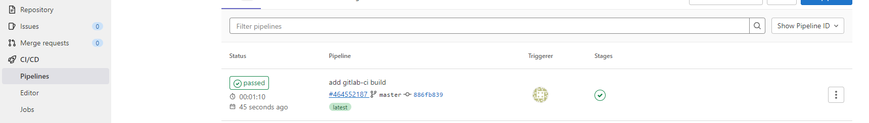 또한 GitLab → CI/CD → Pipelines를 확인해보면 다음과 같이 push에 의해 trigger가 발생한 것을 확인할 수 있습니다.