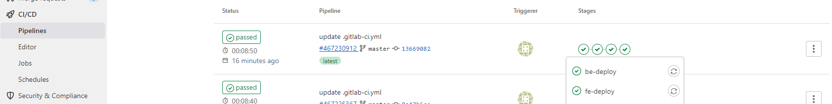 이렇게 .gitlab-ci.yml을 작성한 뒤 commit을 해주고 push까지 해주면 다음과 같이 Pipelines에 trigger가 생성되고 stage마다 fe, be에 해당되는 JOB들이 실행되는 것을 확인할 수 있습니다.