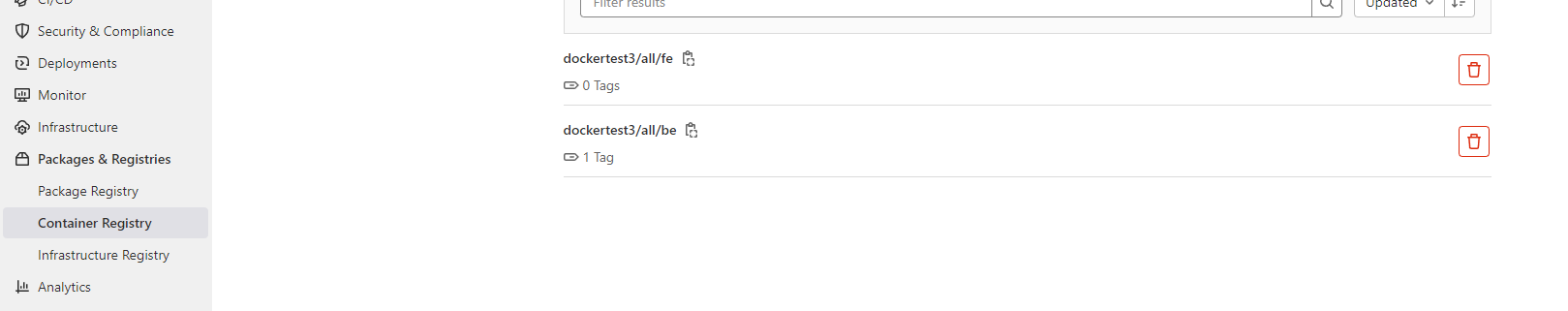 또한 생성된 이미지를 저장하는 Container Registry를 확인해보면 다음과 같이 fe, be의 이미지들이 생성된 것도 확인이 가능합니다.