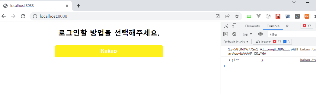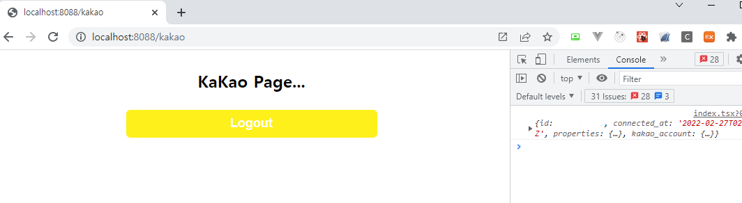 동의하고 계속하기 버튼을 누르면 다음과 같은 화면을 확인할 수 있고 Console을 보면 카카오로부터 데이터들이 넘어온 것을 확인할 수 있습니다.