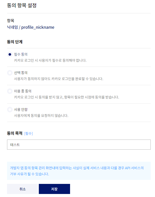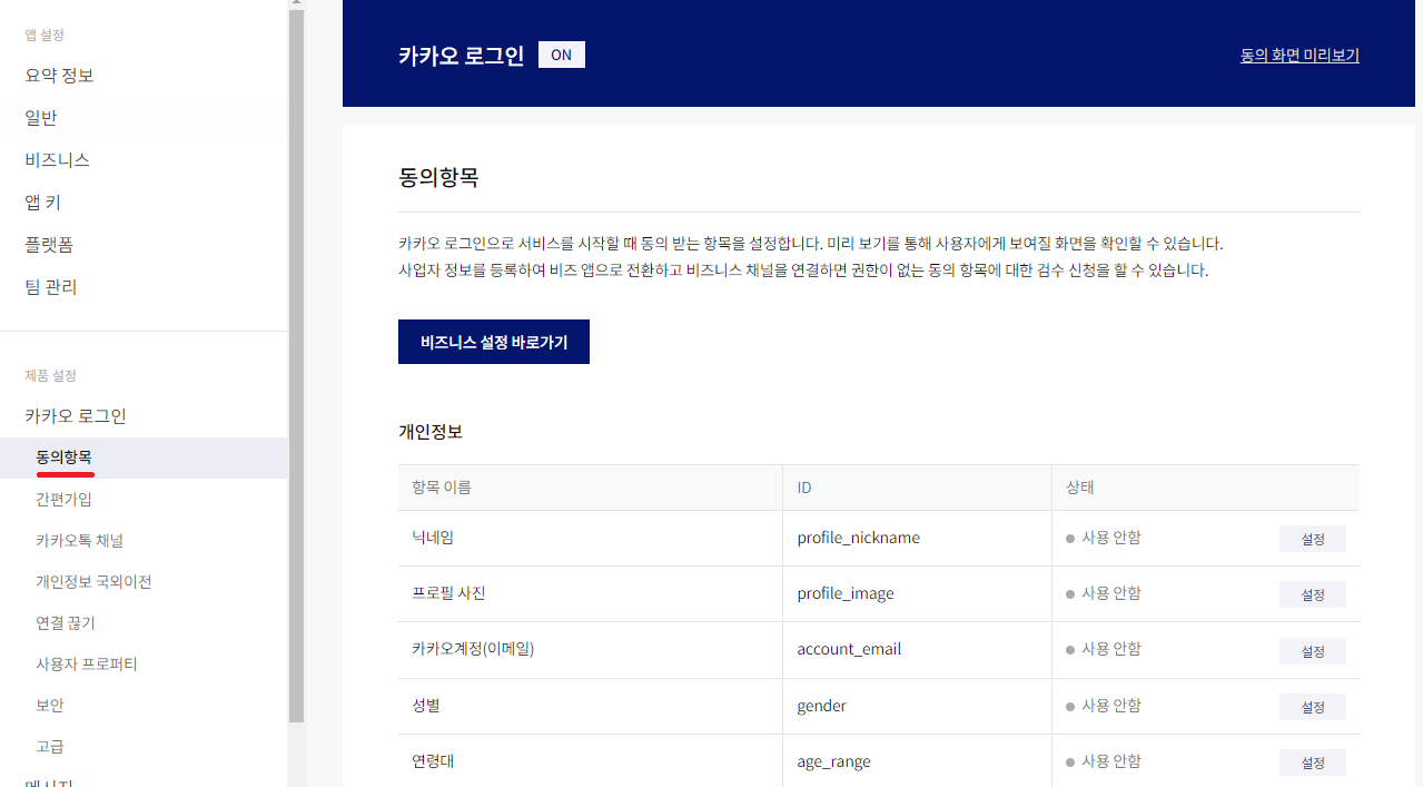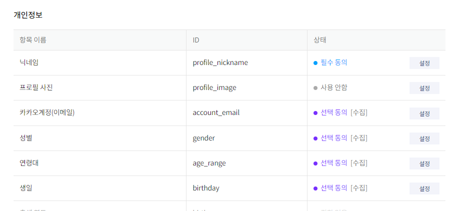 여기서는 로그인을 할 때 카카오를 통해 가져와 사용할 수 있는 개인정보들을 설정할 수 있습니다.