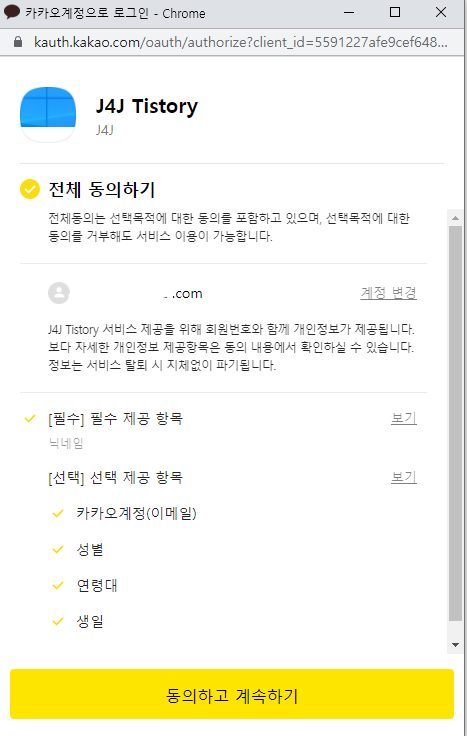 Kakao 버튼을 클릭하게 되면 다음과 같이 정보 동의에 설정했던 항목들을 확인할 수 있습니다.