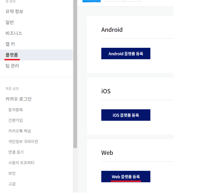 먼저 좌측 메뉴의 "앱 설정 → 플랫폼" 메뉴를 들어가 줍니다.