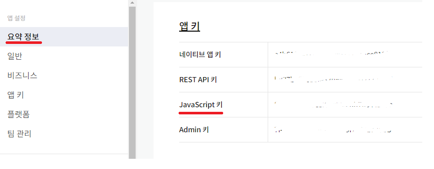 좌측 메뉴의 "앱 설정 → 요약 정보" 메뉴를 들어가면 다음과 같이 JavaScript 앱 키를 확인할 수 있습니다.