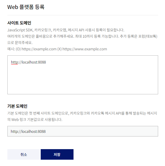 여기서 Web 플랫폼 등록을 누르면 사이트 도메인을 입력하는 화면이 나오는데 카카오 로그인을 사용할 도메인을 입력해주시면 됩니다.