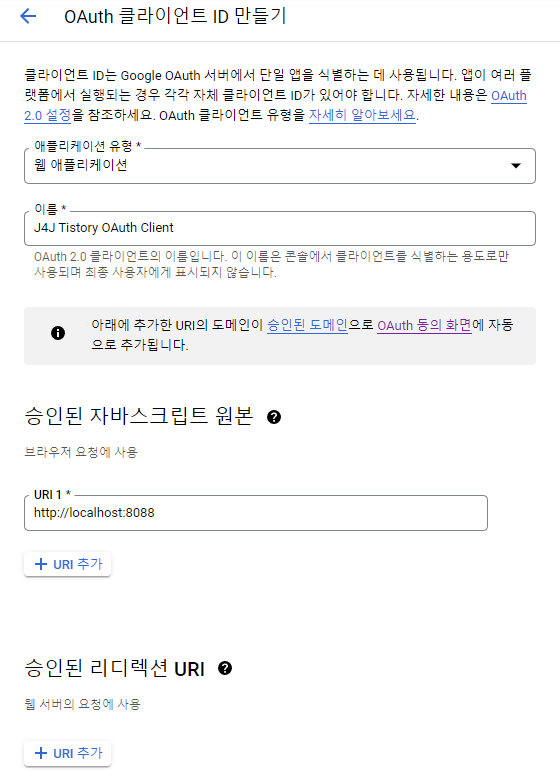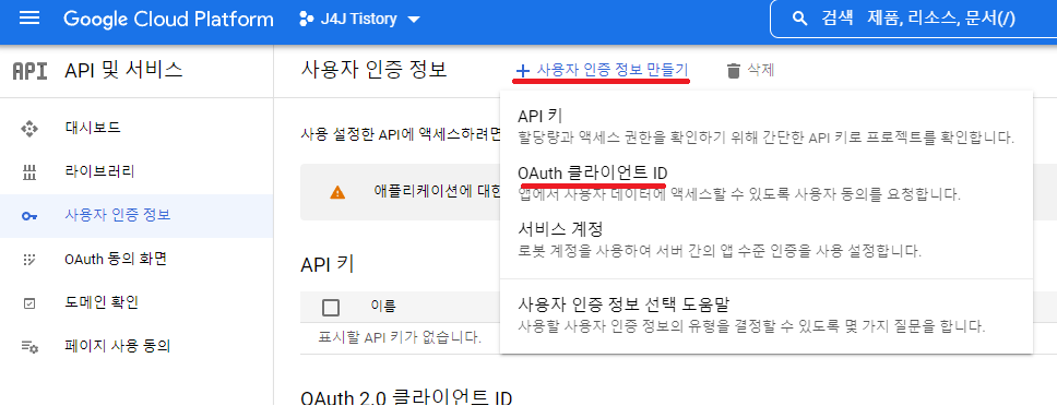 애플리케이션 등록을 완료했다면 방금전에 선택했던 OAuth 클라이언트 ID 메뉴를 다시 클릭해줍니다.