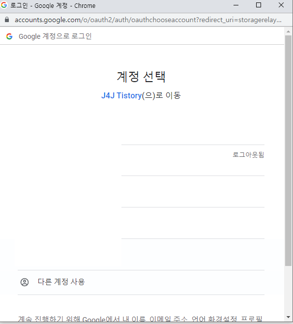 로그인 버튼을 클릭하게 되면 다음과 같이 여러 구글 계정 중 로그인할 계정을 선택할 수 있는 화면이 나옵니다.