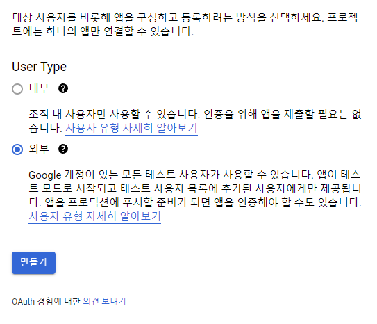 동의 화면 구성을 클릭해주시면 타입을 하나 선택해주셔야 하는데 어떤 목적을 가지고 사용하냐에 따라 한 가지를 선택해주시면 됩니다.