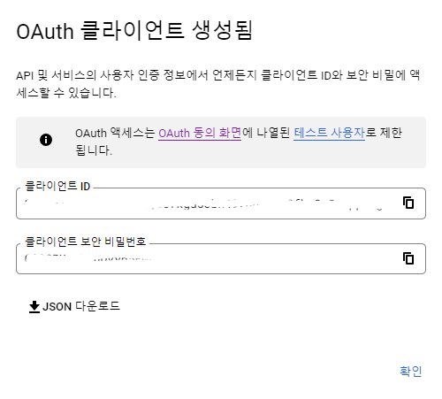 내용 입력 후 만들기 버튼을 클릭해주시면 다음과 같이 클라이언트 ID가 생성된 것을 확인할 수 있습니다.