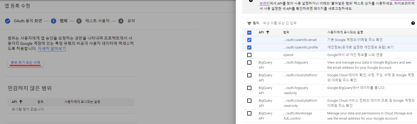 그럼 다음과 같이 범위 설정하는 화면을 볼 수 있는데 여기서는 범위 추가 또는 삭제 버튼을 클릭하여 전달받고자 하는 정보들을 체킹 해주시면 됩니다.