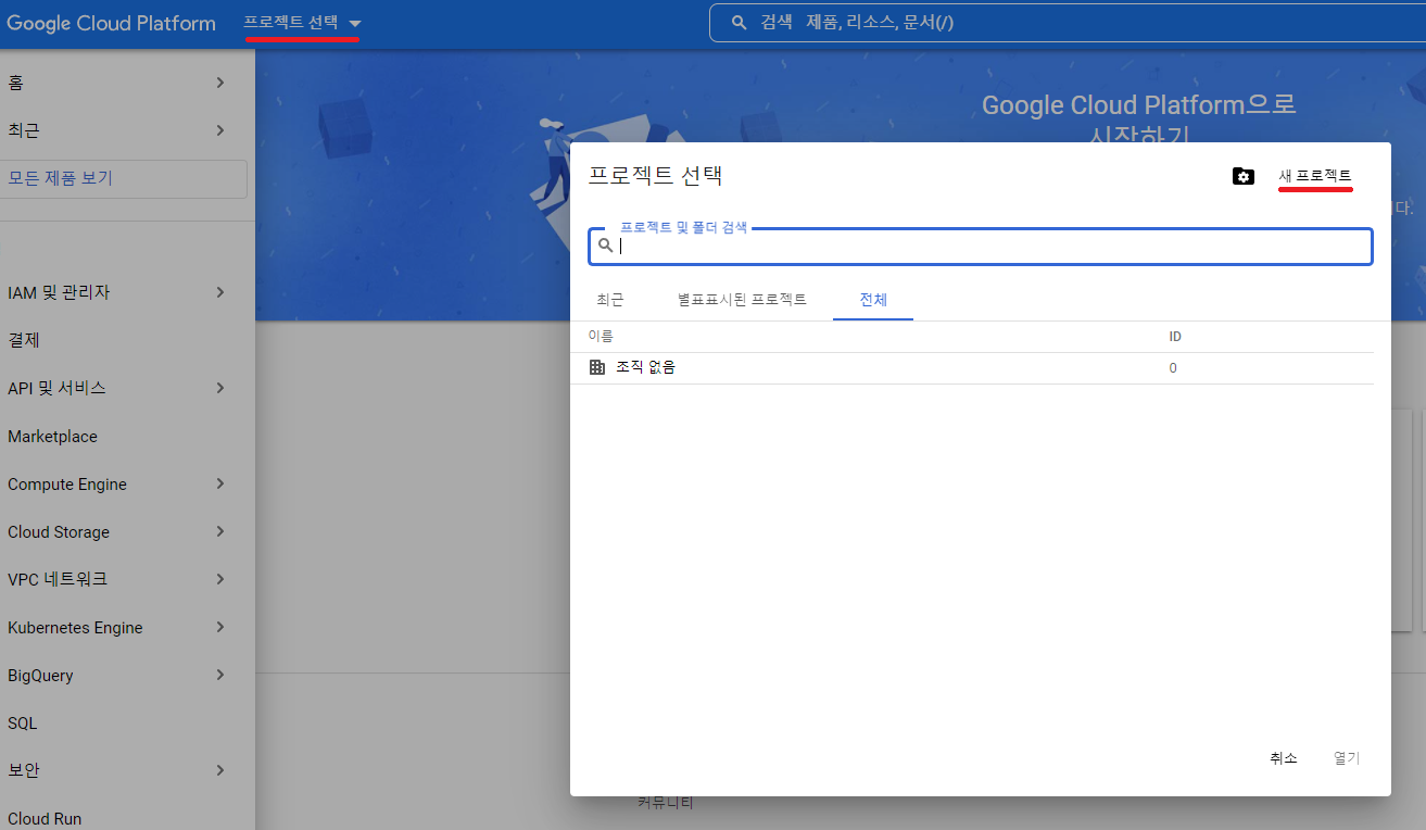 사이트에 접속을 했다면 상단 바에 프로젝트 선택이라는 메뉴가 존재합니다.
