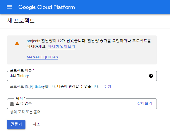 "프로젝트 선택 → 새 프로젝트" 순서대로 클릭을 하면 다음과 같이 프로젝트 정보들을 입력하여 만들어줄 수 있습니다.