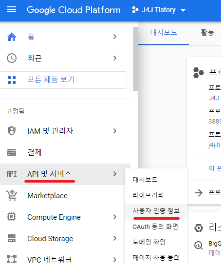 프로젝트를 생성 완료했으면 좌측 메뉴바에서 "API 및 서비스 → 사용자 인증 정보" 메뉴를 클릭해줍니다.