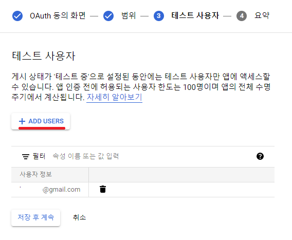 테스트 단계때 테스트를 할 수 있는 이메일 정보를 등록하는 것으로 ADD USERS 버튼을 클릭하여 테스트할 계정을 등록해주시면 됩니다.