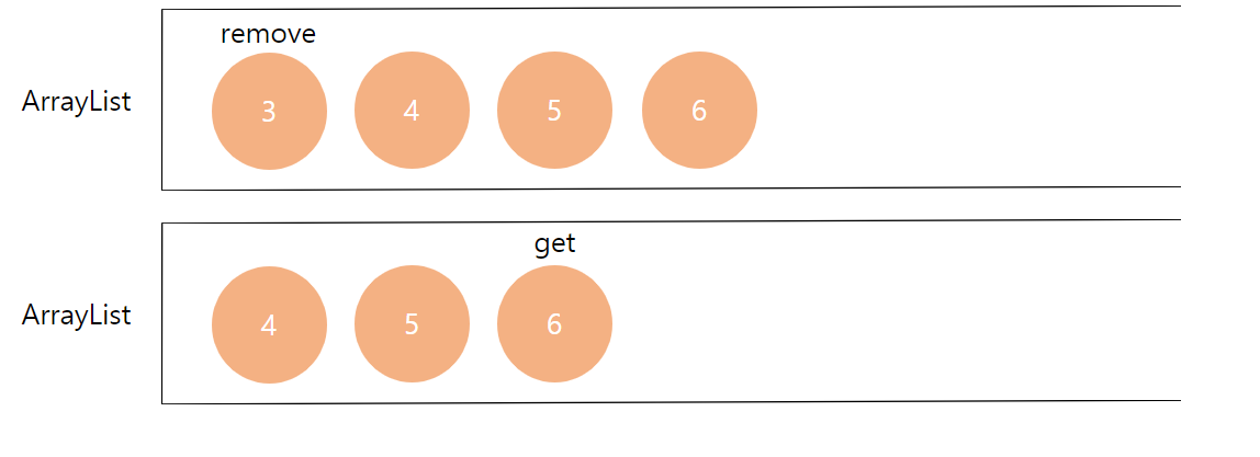 사용된 메서드는 add, remove, get이 있는데 add 같은 경우는 요소를 추가할 때 리스트의 맨 뒤에 추가하고 remove는 index에 맞는 값을 제거하며 리턴해주고 get은 index에 맞는 값을 찾아 리턴해줍니다. (index는 배열과 동일하게 맨 처음 index 값이 0입니다.)