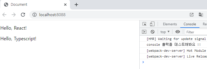 위에서 package.json을 확인해보면 해당 명령어는 development 모드로 실행되기 때문에 다음과 같이 Console 창에 값이 출력되는 것을 확인할 수 있습니다.