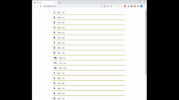 그 결과로 스크롤이 점점 짧아지며 화면에 데이터가 쌓이는 것을 볼 수 있습니다.