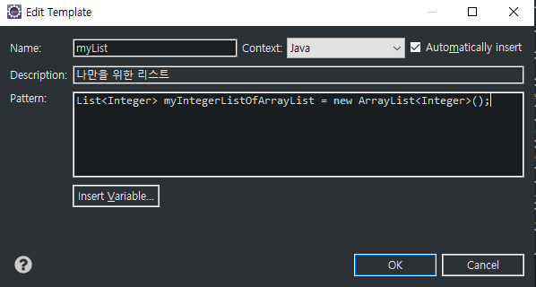 New버튼을 누른 뒤 Name에는 myList, Description에는 나만을 위한 리스트, Pattern에는 List<Integer> myIntegerListOfArrayList = new ArrayList<Integer>();라고 입력을 해보겠습니다.