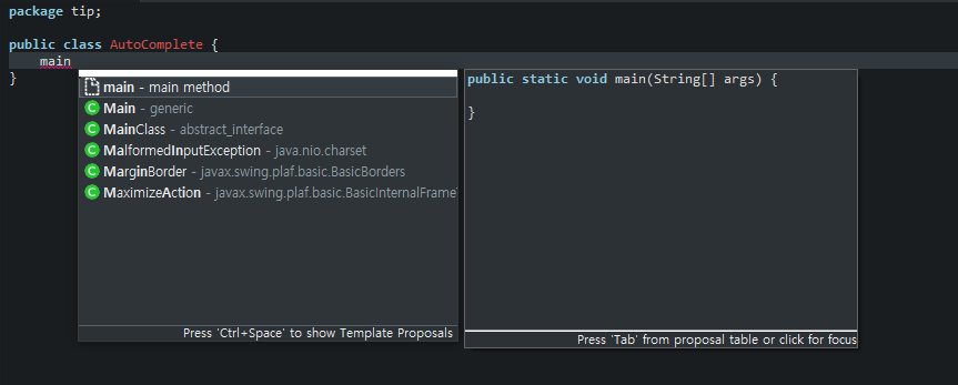 대표적으로 메인함수를 만들 때 pulbic static void main(String[] args)라는 긴 문장을 입력을 해야 되는데 이 코드도 자동완성을 통해 빠르게 작성될 수 있습니다.