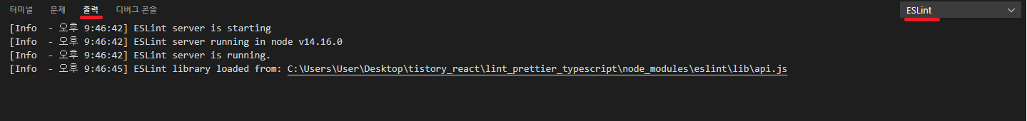 만약 위의 동작들이 모두 정상적으로 동작되지 않을 경우 VSCode 하단의 "출력 → ESLint"에 들어가 보면 어떤 문제가 발생되고 있는지 확인할 수 있습니다.