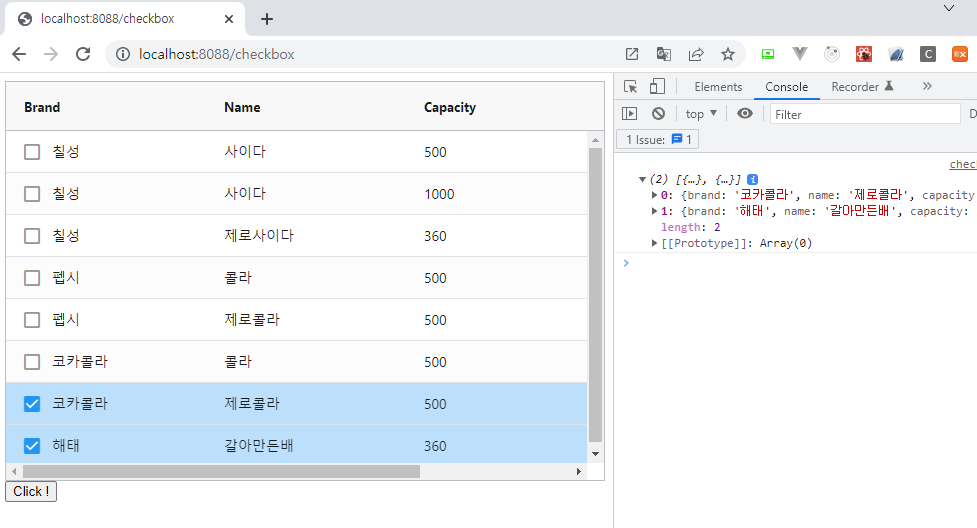 또한 row를 선택하고 Click ! 버튼을 누르면 다음과 같이 console창에 선택한 데이터가 확인되는 것도 볼 수 있습니다.