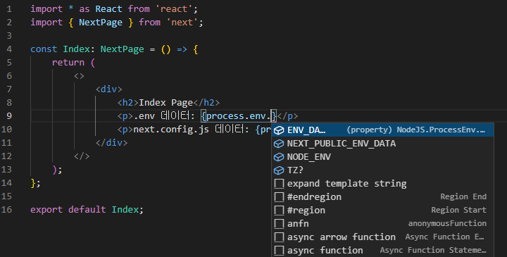 그리고 .env나 next.config.js에 설정한 변수를 사용하기 위해 코드를 작성하고자 하면 자동 완성이 되지 않기에 자연스럽게 입력한 변수 값의 이름을 Copy & Paste를 하는 자기 자신을 확인할 수 있습니다.