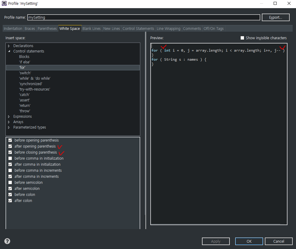 예를 들어 for문을 선언할 때 괄호 안의 양 끝에 공백을 추가하고 싶다면 White Space탭에서 Control statements → 'for'에 들어가 after opening parenthesis와 before closing parenthesis를 체크해주면 됩니다.