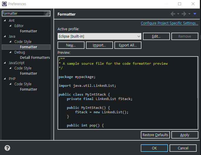 설정을 변경하는 방법은 이클립스 상단의 Window → Preferences에 들어가서 formatter라고 검색을 한 뒤 Java → Code Style → Formatter에 들어가시면 됩니다.
