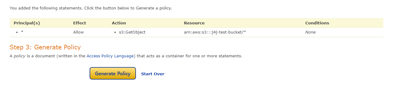 모든 설정을 끝냈다면 Add Statement를 클릭해주고 그 뒤엔 Generate Policy를 선택하여 생성된 정책을 복사해줍니다.
